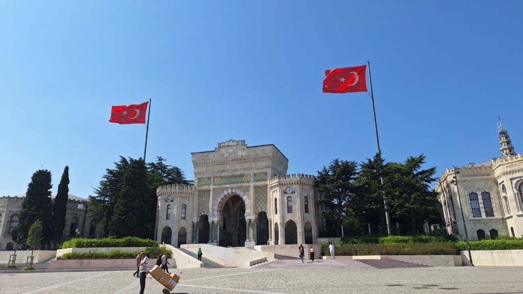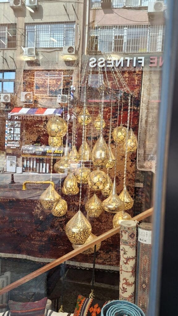 This is the Turkish flag — but it bugs me because I saw it hanging this way a lot and, properly hung, the moon should be on the left and a “C”. This area was all book stores. And a minaret was everywhere, with the speakers high at the top, since ‘call to prayer’ happens 5 times a day and all the people should be able to hear it.
