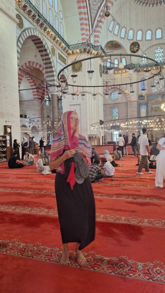 We had to cover our shoulders, hide our legs and remove our shoes for the mosques.