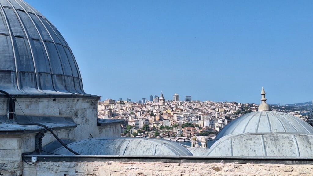 View of the Asia side of Istanbul. It is the only city in two continents. 3% is in Europe and the rest is in Asia. The building on the right is a hammam. You can tell by the glass covering the holes in the dome.