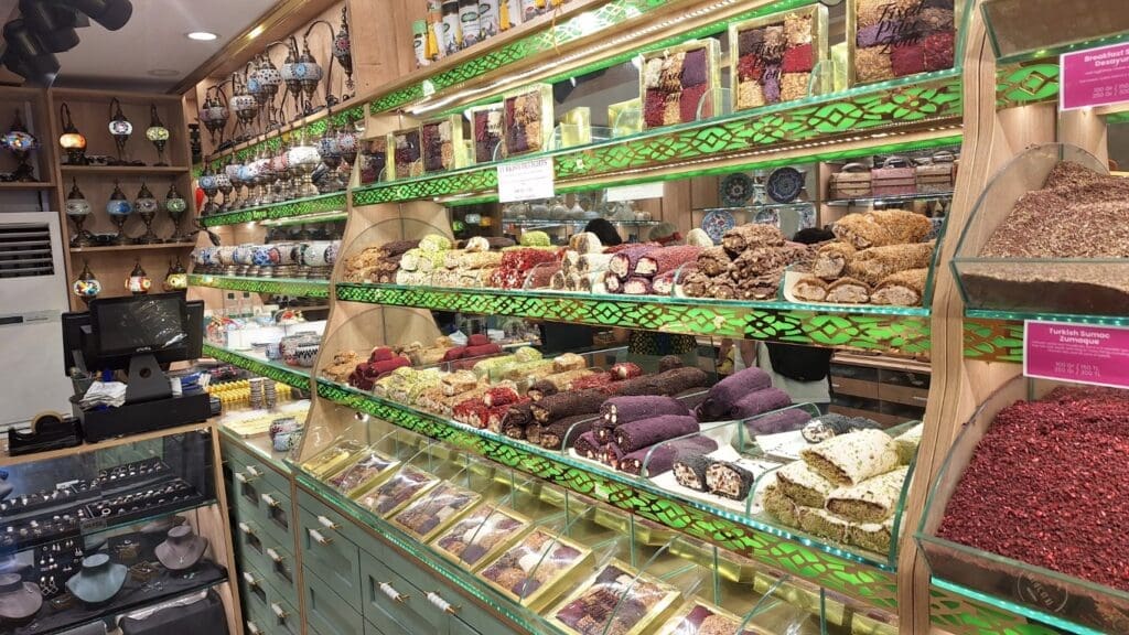 Found a spice store and bought a couple rolls of Turkish Delight. The white is a marshmallow cream! The green is usually pistachio. Pistachios are grown in Turkiye, but they export most of it, so it’s quite expensive.