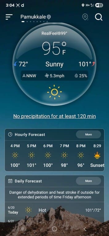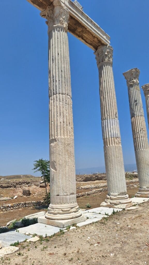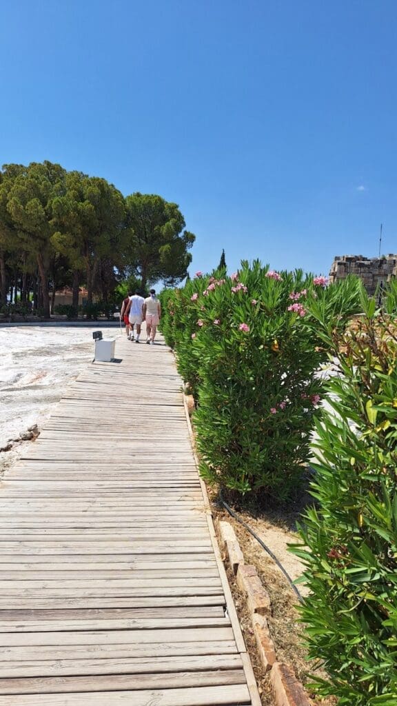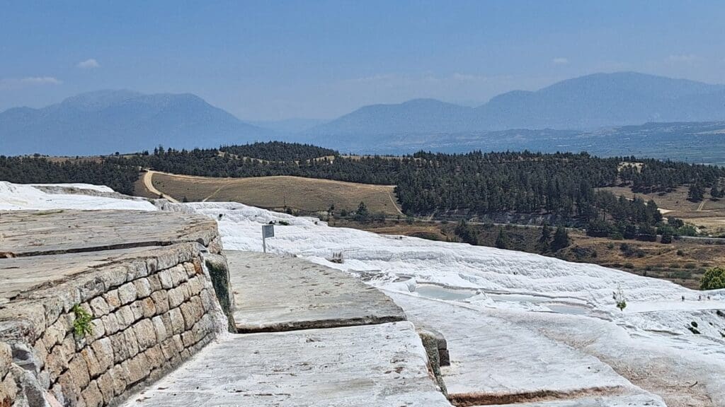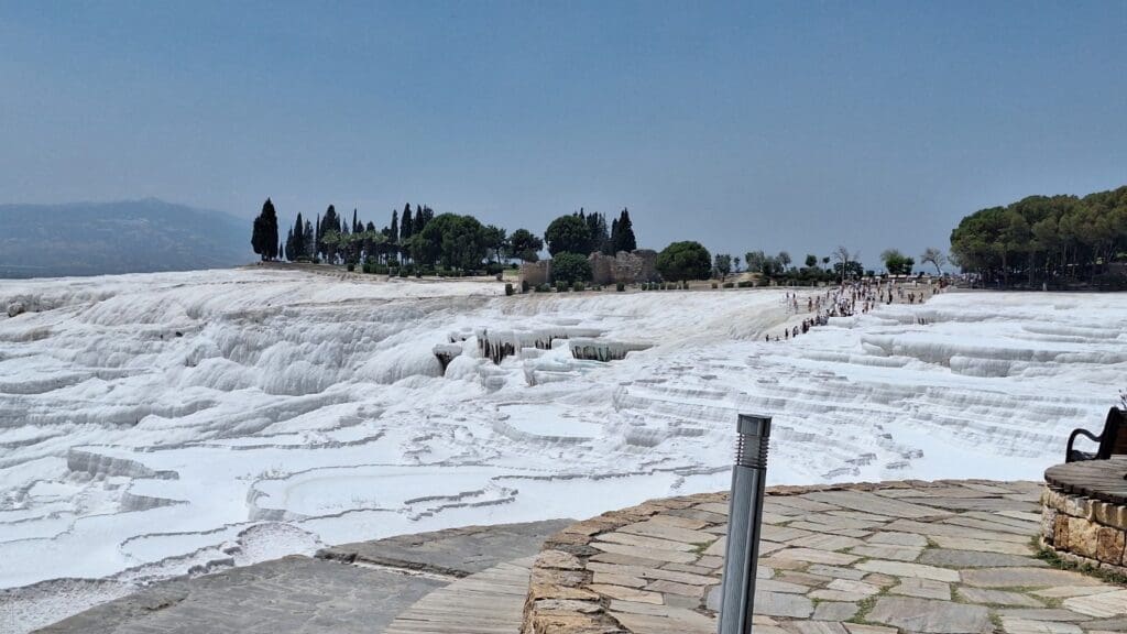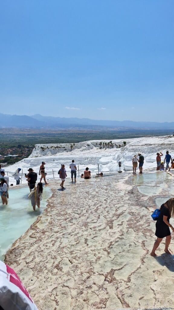 This was in Pamukkale. The waters are so rich in calcium carbonate that the sides of the mountains look white, like frozen waterfalls. The calcite-laden waters have dripped down over a series of terraced levels and created a fairyland of bizarre solidified cascades and shell-shaped basins. It looks like cotton and thus the name Pamukkale, Cotton Castle.