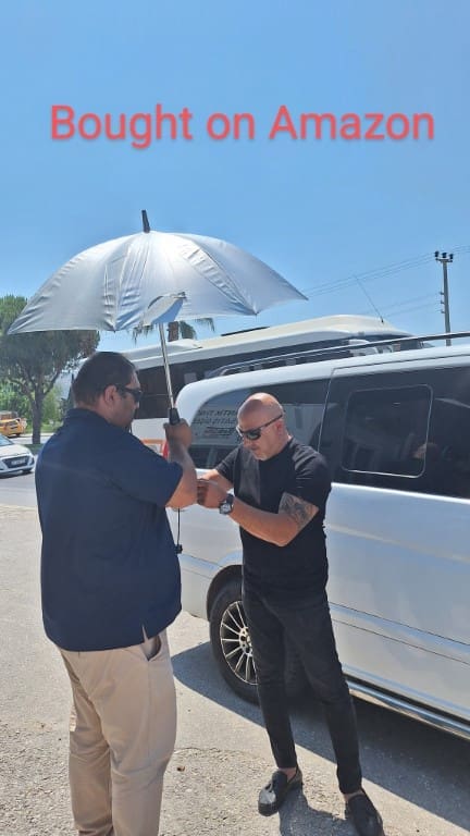 This was Faret our driver and Milth our Tour Guide adjustig the umbrella Milth had purchased on Amazon. An umbrella works wonders to keep the heat off your head.