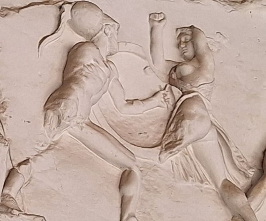 These are Amazon women fighters. Don’t know if it’s true or not, but the story says they came from Asia Minor and there is an oft-repeated “fact” that Amazons had a tradition of cutting off one of their breasts. It was said that they did this to more easily fire a bow and hurl a spear. Turns out that is not true.