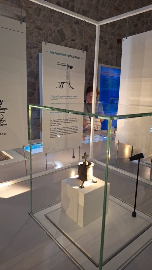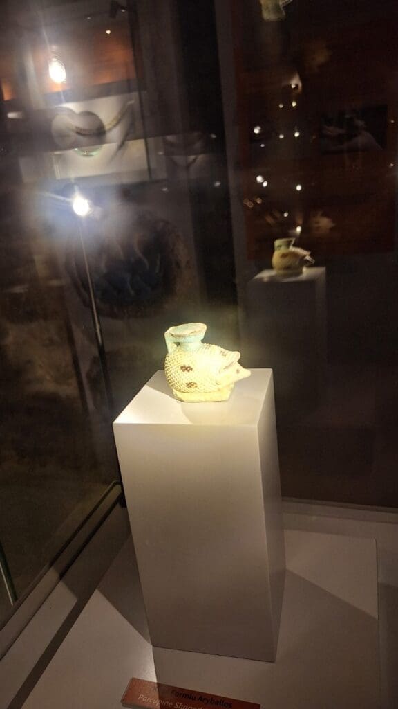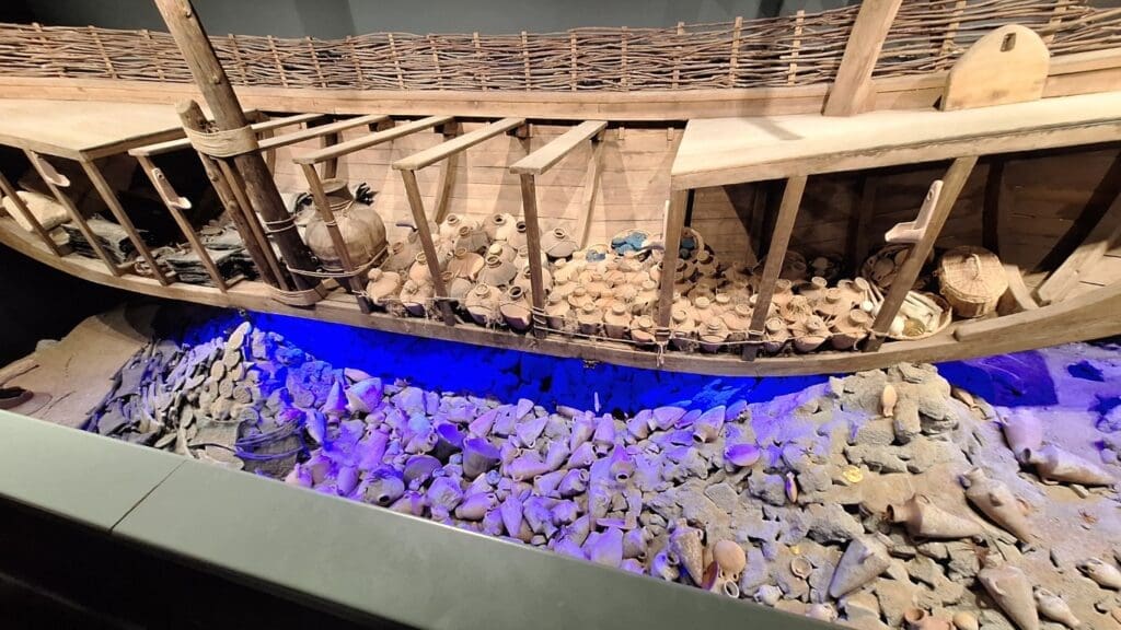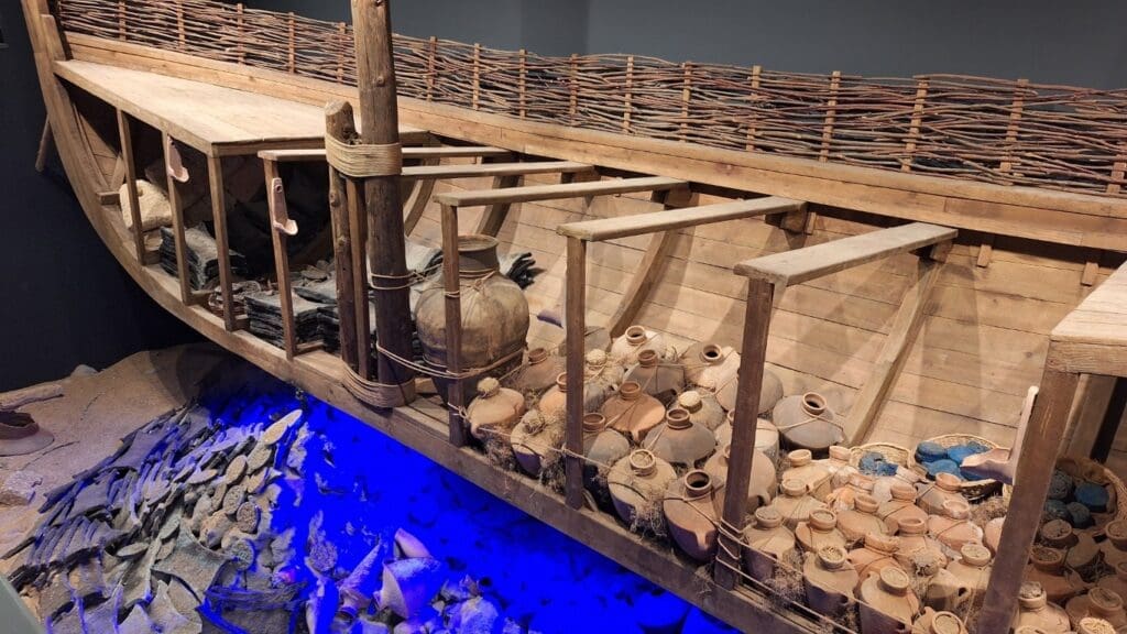 Don’t know why the blue color, but this is an actual boat that sank along with its contents that was discovered at the bottom of the sea hundreds of years later.
