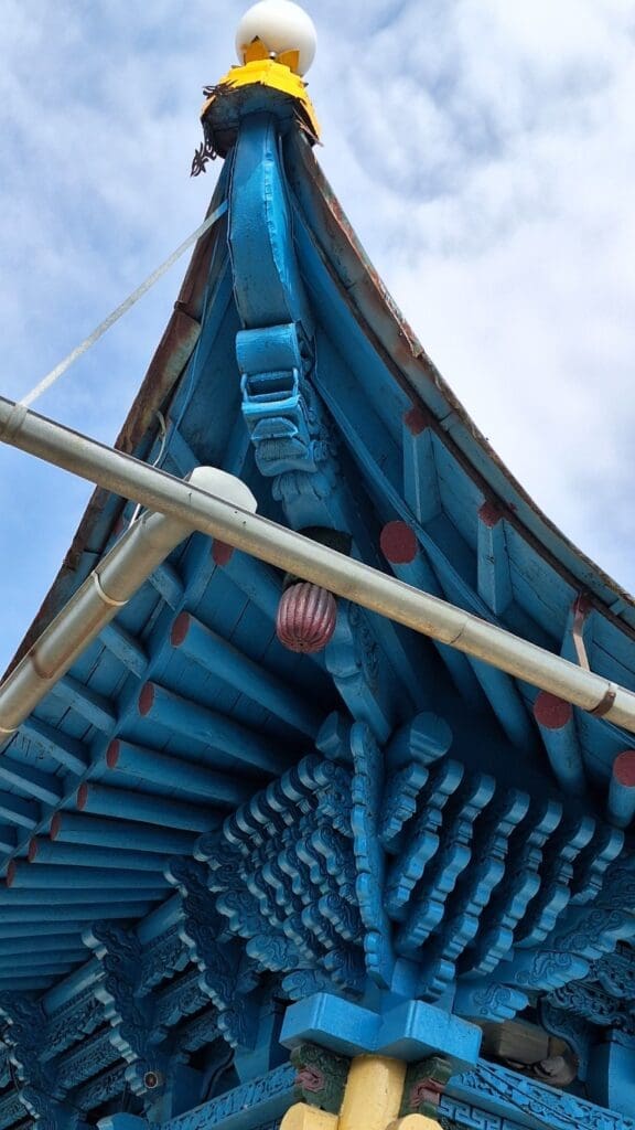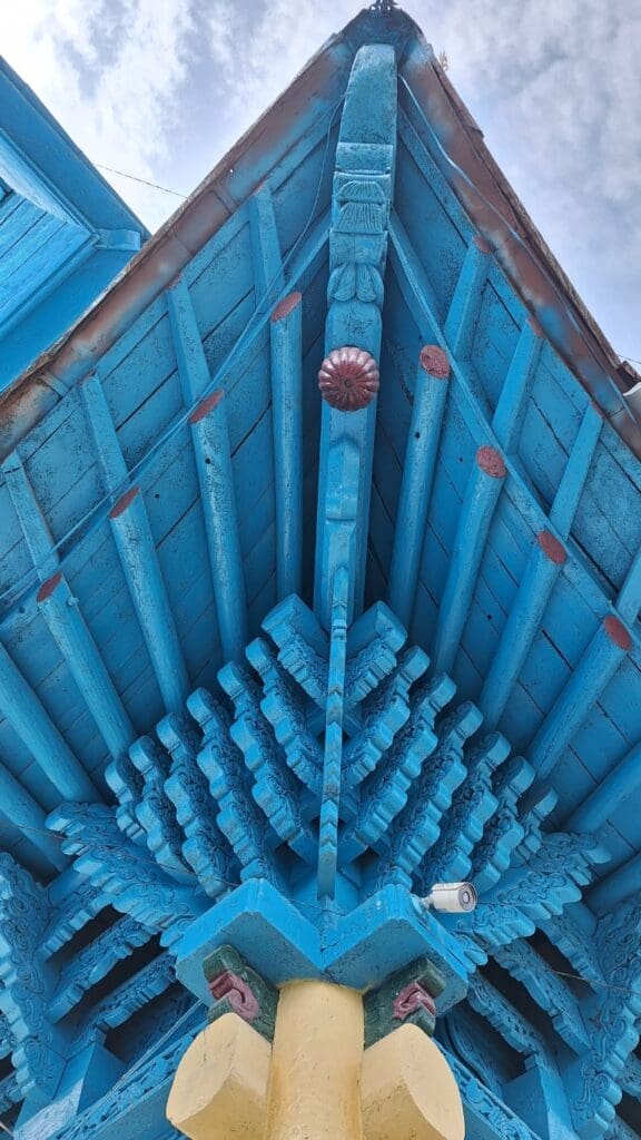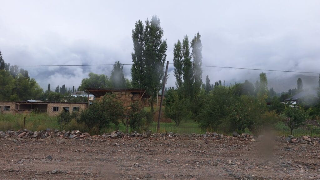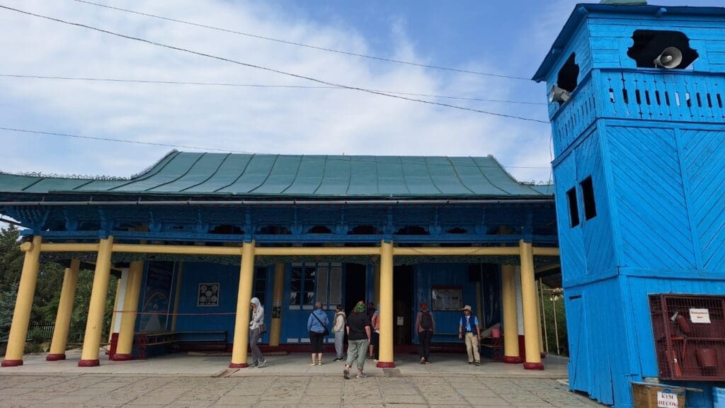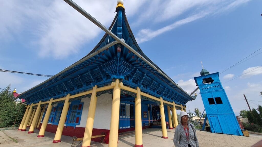 Dungan Mosque. I think it funny that the blue tower is a minaret — but nothing like the beautiful blue minarets of tile in Uzbekistan.