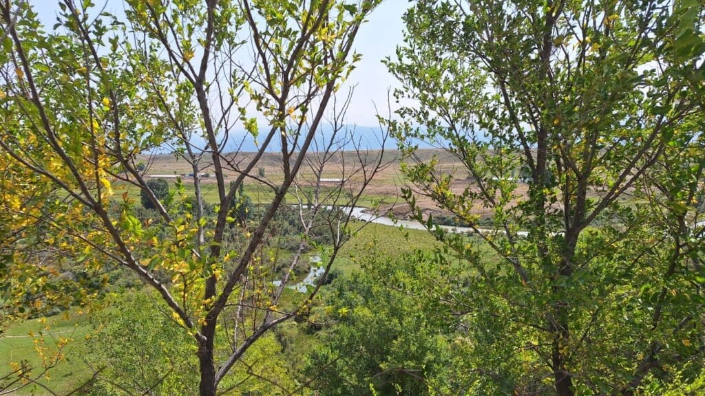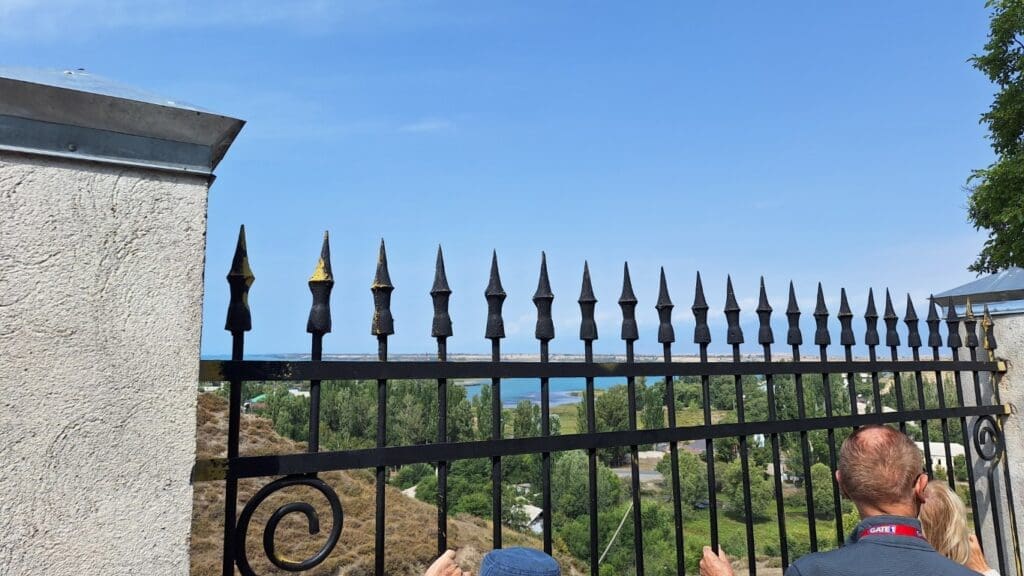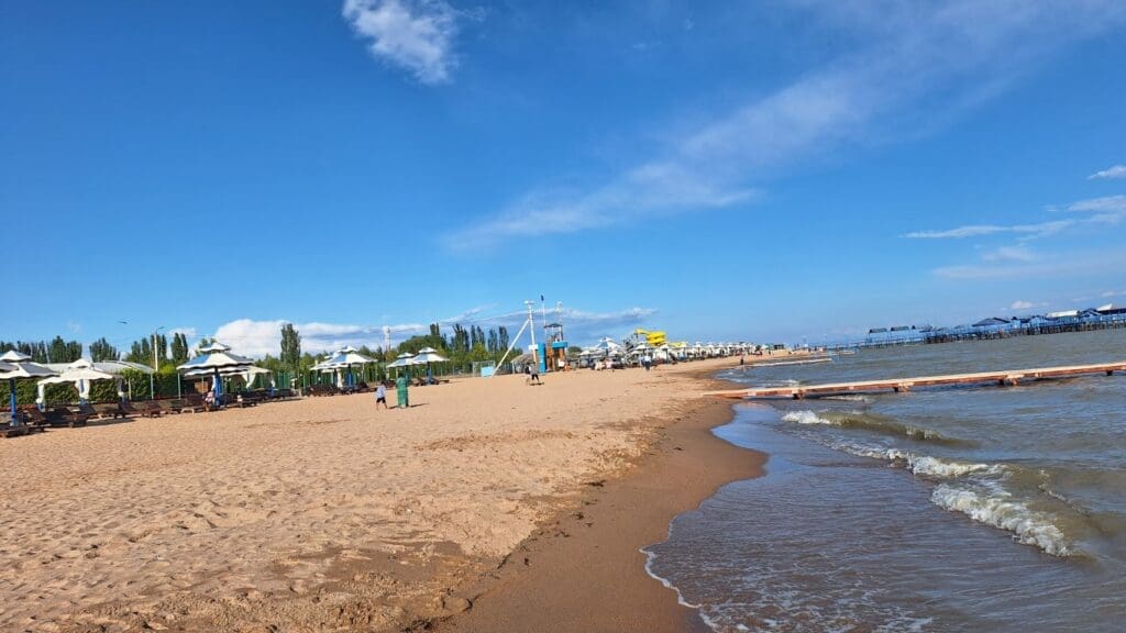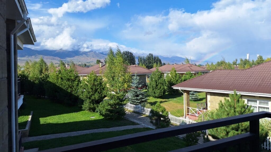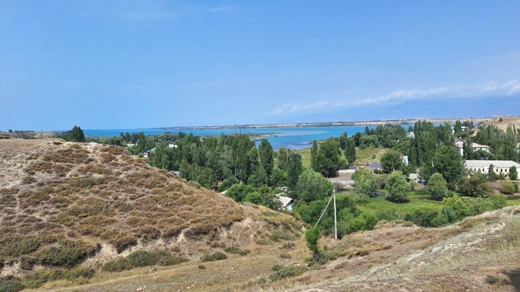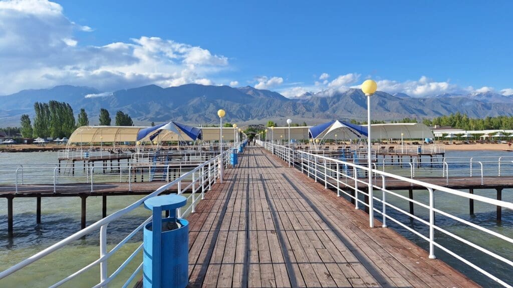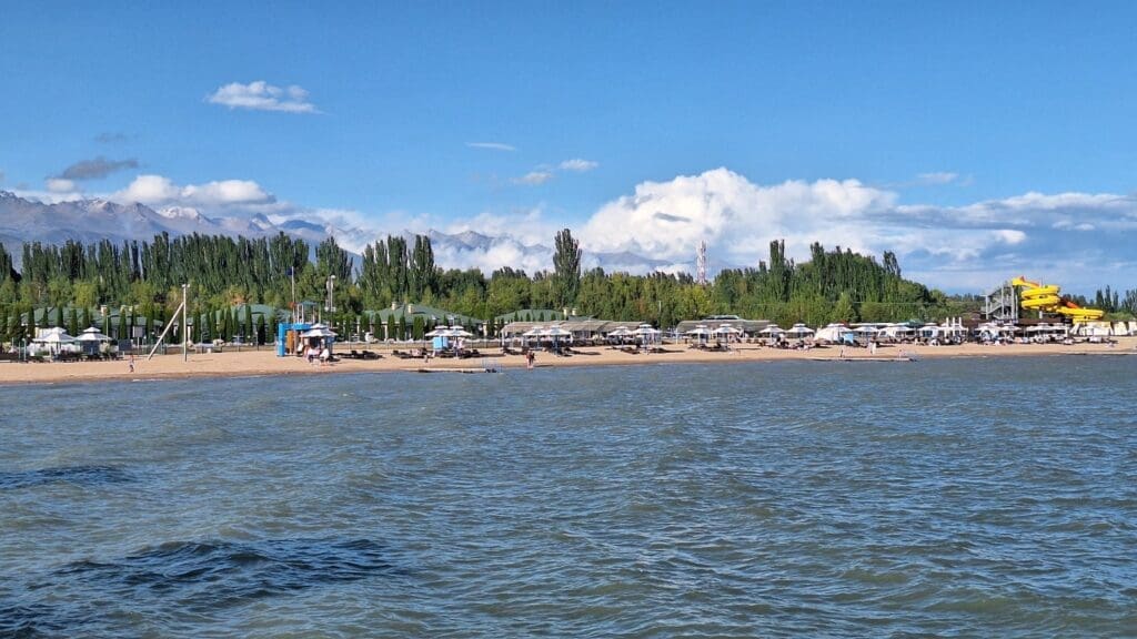 Resort on the country’s largest lake, with mountains in the background. The town is Cholpon Ata on the north shore of Issyk Kul Lake.