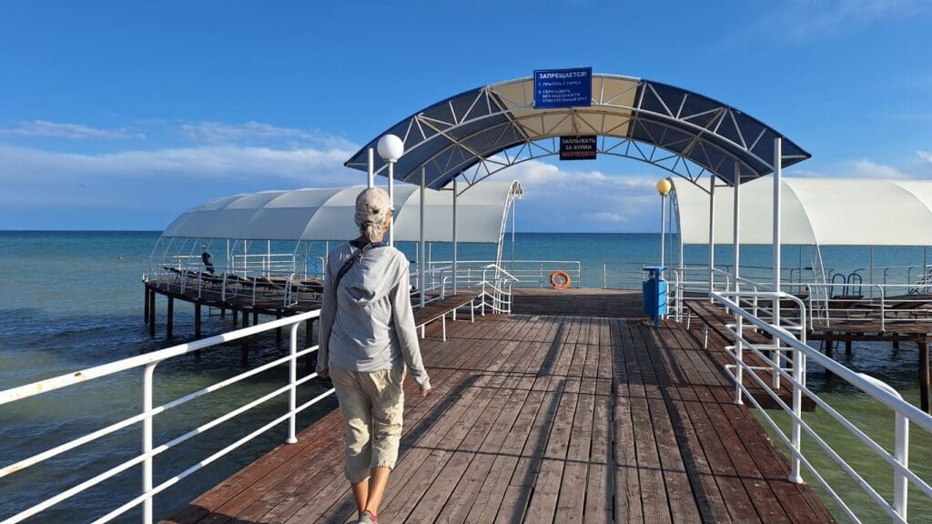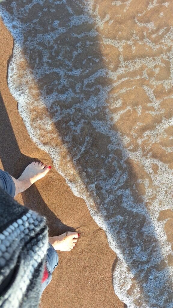 Sweater on with feet in the water! I think the sand had been shipped in — but still great.