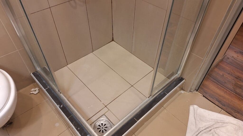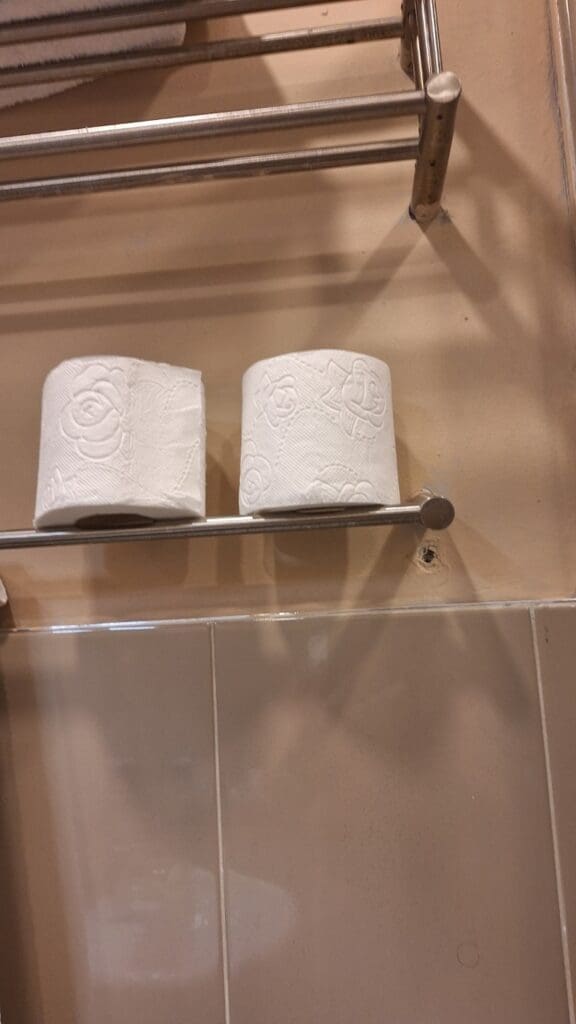 I’m getting a little picky about our rooms. The two glass doors of the shower that were supposed to slide together were missing, the tape around the vents when they painted the wall is still there, and the toilet paper holder was just a crummy shaky towel bar way up over the toilet. I am getting fussy.