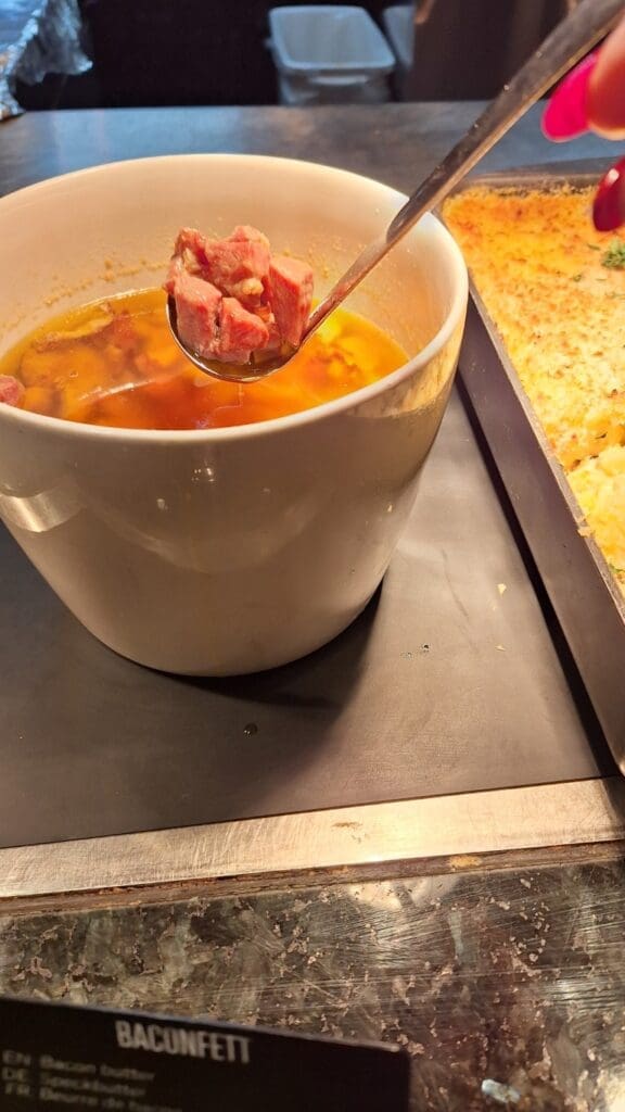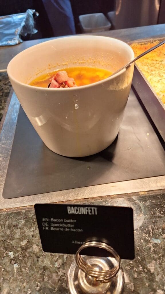 And, surprise!, I found it on the buffet table of the cruise ship. Bowl of melted butter with tiny diced pieces of bacon. Two ways to kill you instead of one!